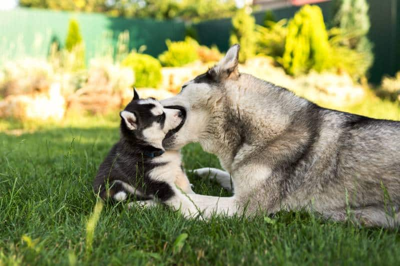 Позже, когда щенки начинают постоянно общаться с другими взрослыми собаками и вливаются в стаю, поведение «попрошайничества» меняет смысл. Теперь малышня облизывает и кусает других собак за морду не только чтобы попросить еды, но и чтобы получить их одобрение и благосклонность: «Смотри, какие мы маленькие и хорошенькие!», «Не обижайте нас, мы ещё дети!». Облизывание морды — это типично-детский жест, призванный успокоить взрослую собаку и сгладить острые углы, если вдруг щенок накосячил. При этом старший пёс может в ответ прикусить дитё за морду с посылом «Я тебя понимаю и принимаю».