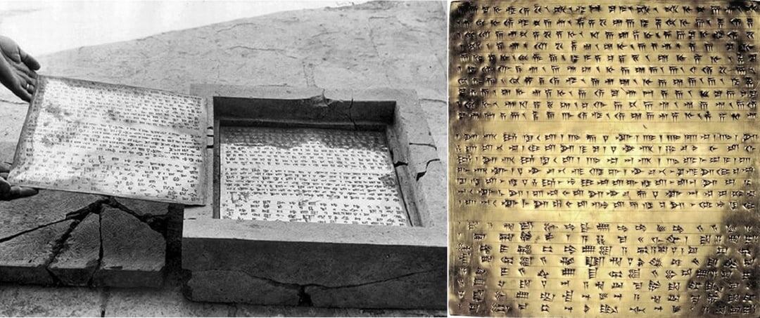 Золотые фундаментные таблички царя Ахеменидской державы Дария I в оригинальном каменном ящике, 510 год до нашей эры