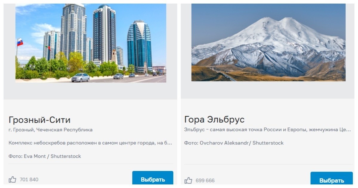 По данным на 18:20 мск 12 октября по оборотной стороне было два лидера — Эльбрус (1,26 млн голосов) и «Грозный-Сити» (1,073 млн).
