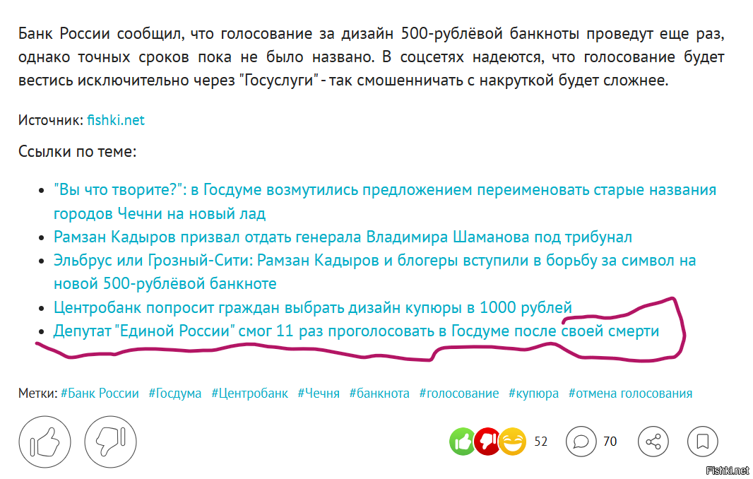 Банк России сообщил, что голосование за дизайн 500-рублёвой банкноты проведут еще раз, однако точных сроков пока не было названо. В соцсетях надеются, что голосование будет вестись исключительно через "Госуслуги" - так смошенничать с накруткой будет сложнее.