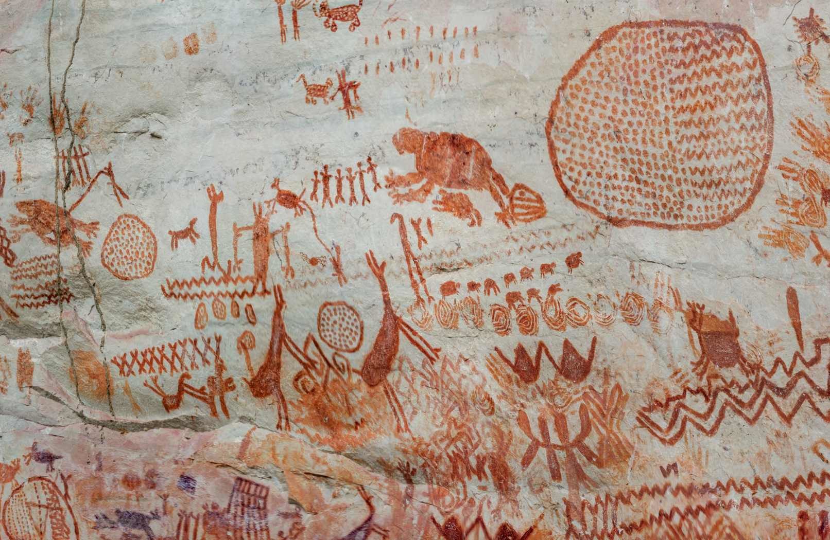 Во-вторых, “есть разнообразие картин”, сказал он. “Из водной среды обитания встречаются рыбы, черепахи, анаконды, удавы. Но есть и птицы, такие как орлы и королевский стервятник. Затем о наземных животных: обезьянах, оленях, гигантских ленивцах и лошадях.” Здесь также присутствуют абстрактные образы и изображения тонко прорисованных фигур, в том числе танцовщицы в середине поворота.