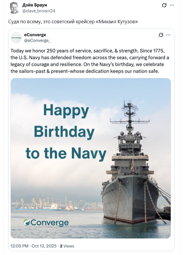 Однако волну поздравлений было уже не остановить. Обнаружилось, что американцы крайне слабо разбираются в судах, потому что в последующих постах другие аккаунты, в том числе ветеранские и общественные, публиковали фото российских кораблей, в частности, крейсера «Михаил Кутузов».