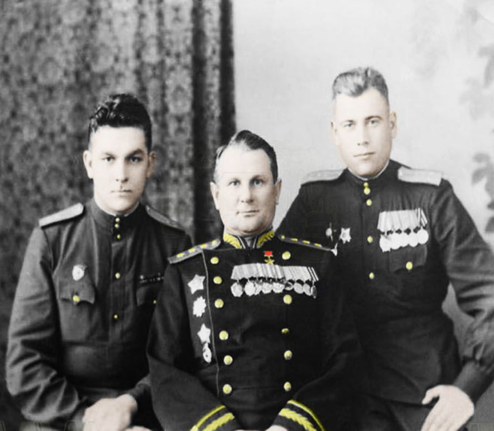 Форма офицера справа не советская, пистолет наши на пузе не носили, автоматчик с немецким автоматом (MP-40?).