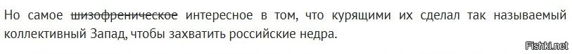 Но самое шизофреническое интересное в том, что курящими их сделал так называемый коллективный Запад, чтобы захватить российские недра.