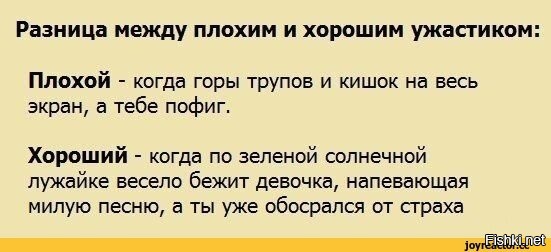 Как и с фильмами, которые нас смешат или тревожат, страх — штука личная. То, что доводит одного до паники, у другого вызывает разве что лёгкое недоумение. У каждого свои триггеры, и хорроры только подливают масла в огонь, потому что они не всегда сняты, чтобы напугать. Иногда это просто игра на нервах, демонстрация монстров или чёрный юмор с кровавыми акцентами.