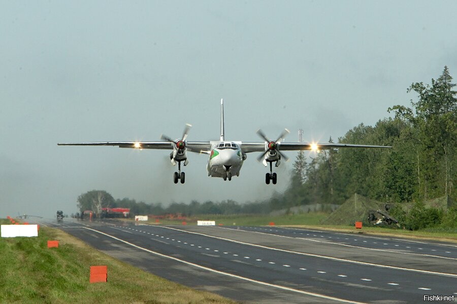 Для сравнения 134-ка в момент посадки даёт уже более 20 тонн на каждую заднюю стойку шасси - мягкое покрытие (асфальт) просто волной пойдет (потому стойки и подламываются), а вот обычное поле стойки просто вспашут.