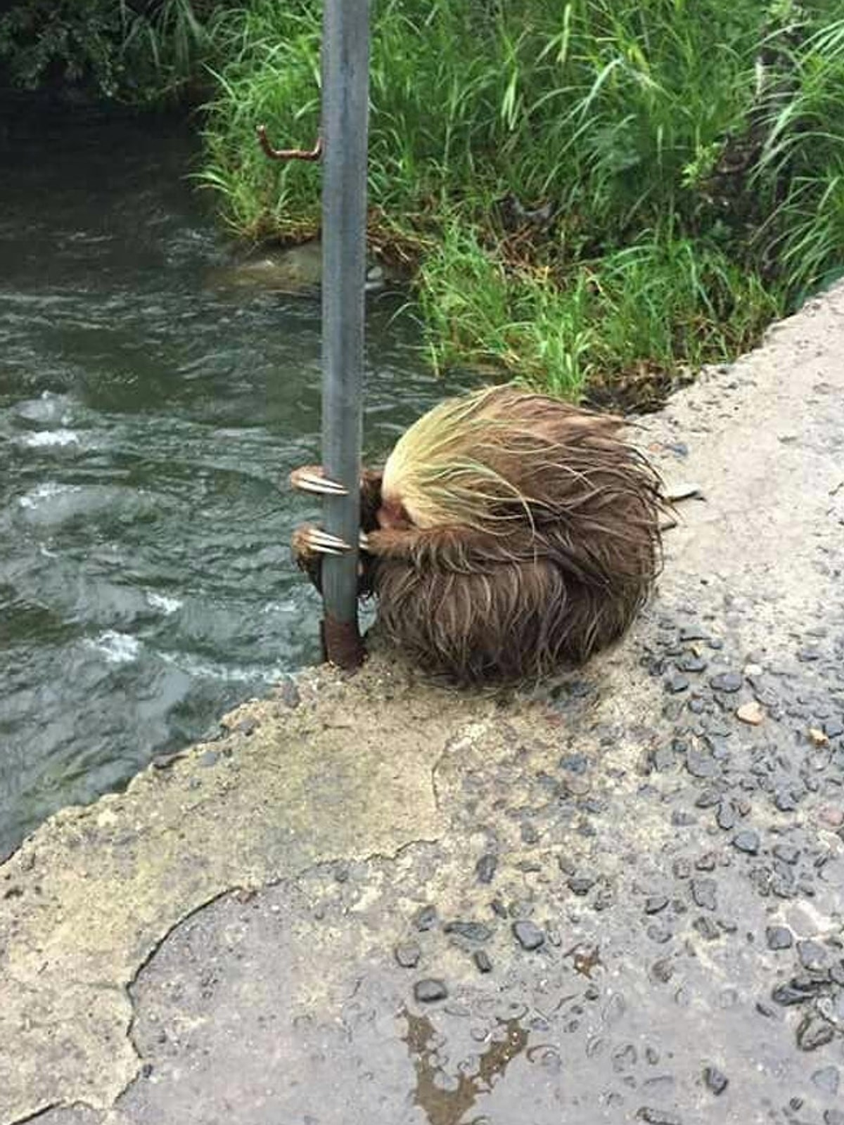 20. Испуганный ленивец в Коста-Рике цепляется за столб после урагана Отто