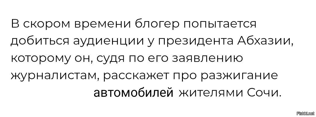 «Я приехал в Абхазию, в ту же ночь мою машину, которая находится в Сочи, сожгли. На самом деле машина принадлежит не мне, а супруге моего брата, русской девочке. Хочу идти к президенту Абхазии. Кому-то я, видимо, перешёл дорогу. Кто-то раздул мыльный пузырь, мол, абхаз пристанет к русской девчонке. Уже и межнациональную рознь повесили на меня.