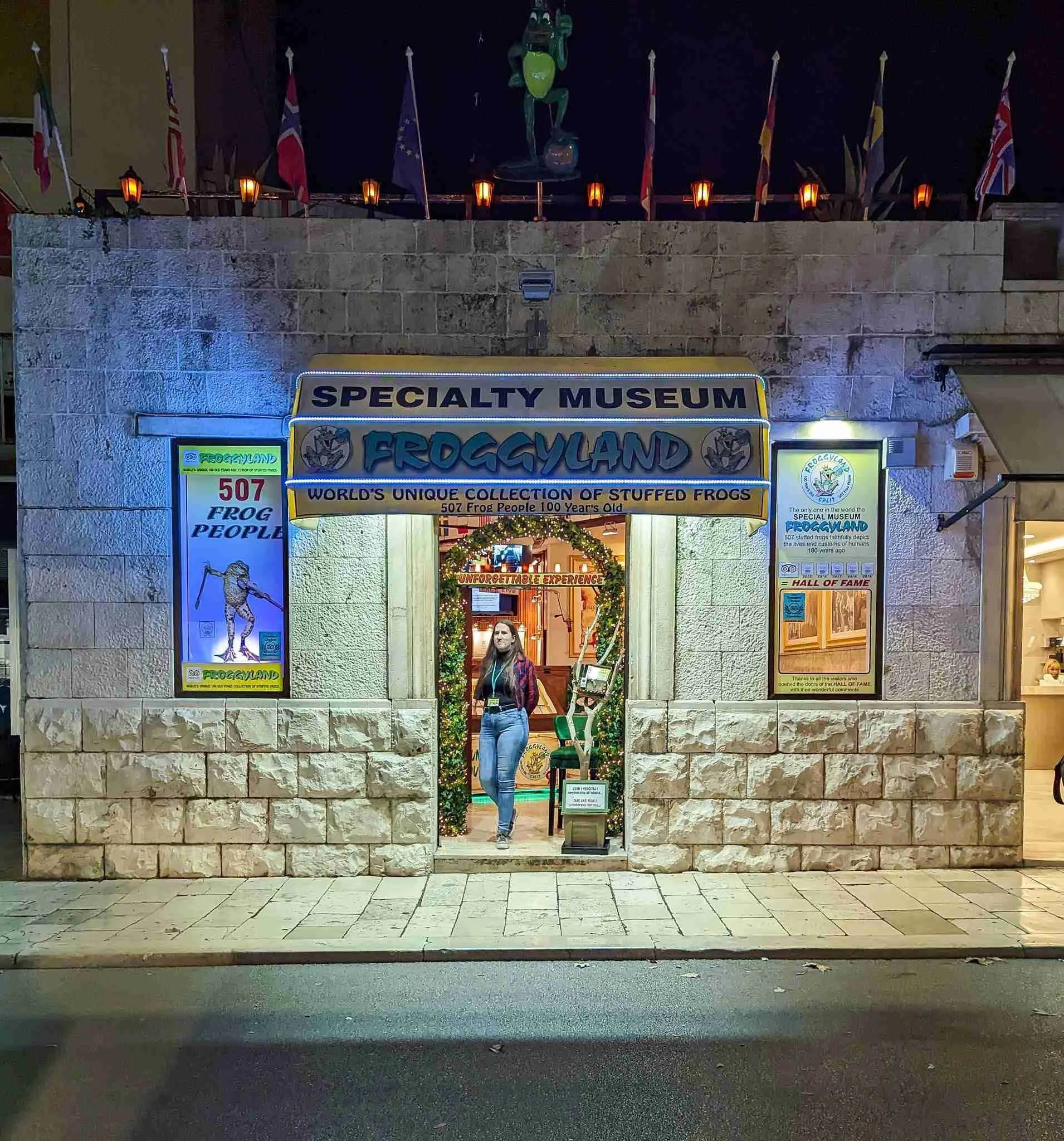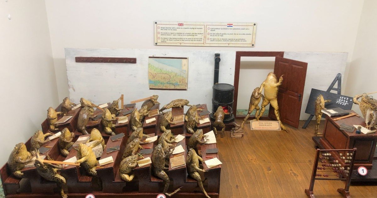 Этот музей в Сплите, Хорватия, идеален для ценителей необычного. В его коллекции — 507 чучел лягушек, которые кажутся живыми и вовлечёнными в человеческие занятия. Froggyland расположен рядом с дворцом 4-го века, построенным римским императором Диоклетианом. На 21 диораме земноводные изображены в разных сценах повседневной жизни: учёба, вечеринки, работа.