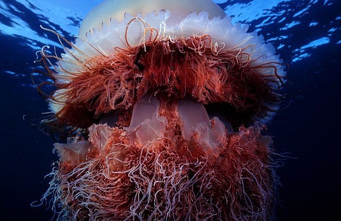 Вид снизу. Самый крупный экземпляр этой гигантской медузы, выброшенный на берег в 1865 году, имел купол диаметром 2,1 метра и щупальца длиной 36,6 метра.