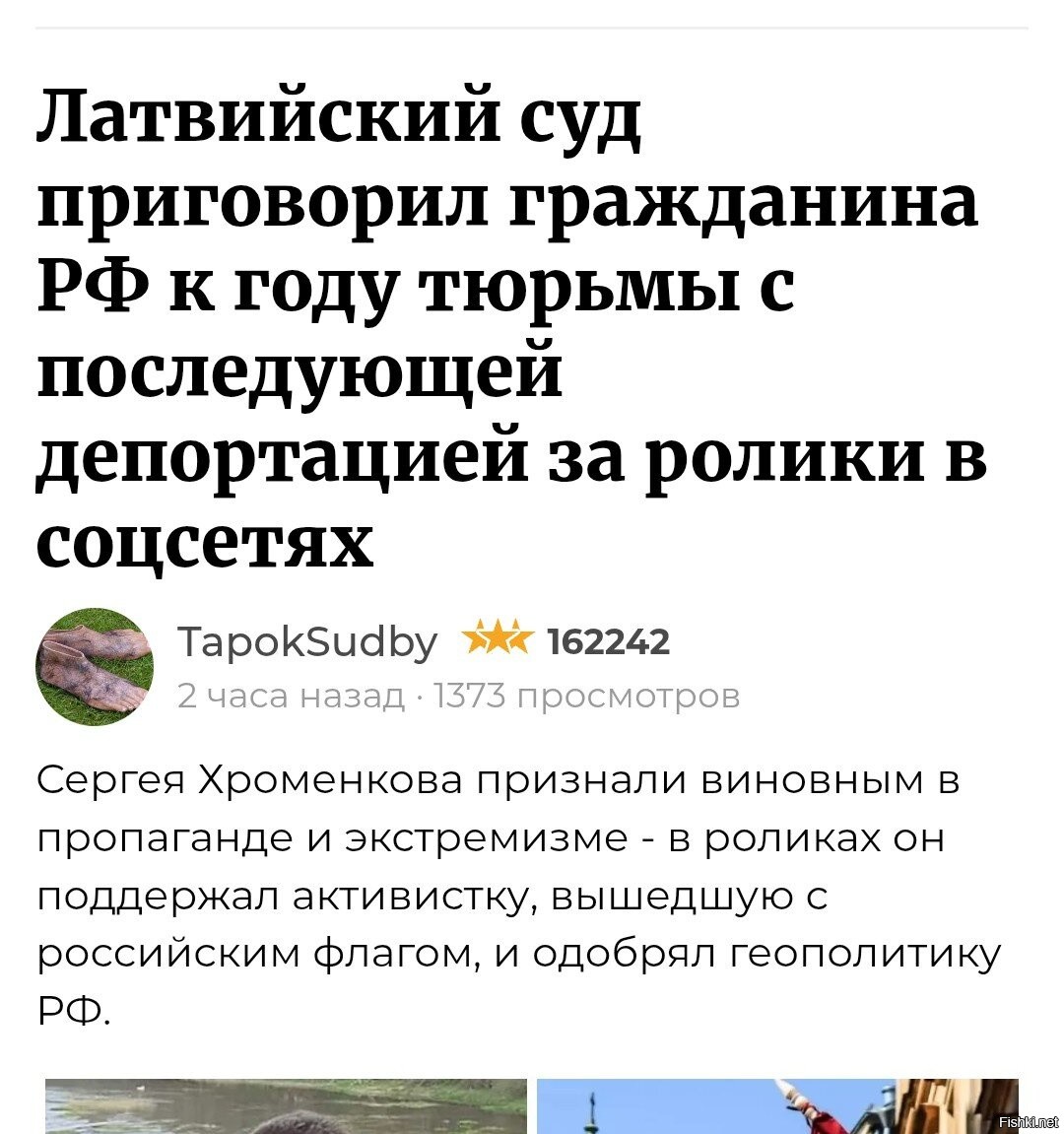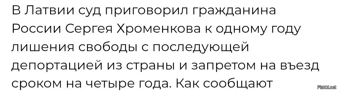 В Латвии суд приговорил гражданина России Сергея Хроменкова к одному году лишения свободы с последующей депортацией из страны и запретом на въезд сроком на четыре года. Как сообщают Sputnik Латвия и Известия, такое решение вынес Курземский районный суд в Вентспилсе, признав Хроменкова виновным в публичном оправдании преступлений против человечности и прославлении военных преступлений.