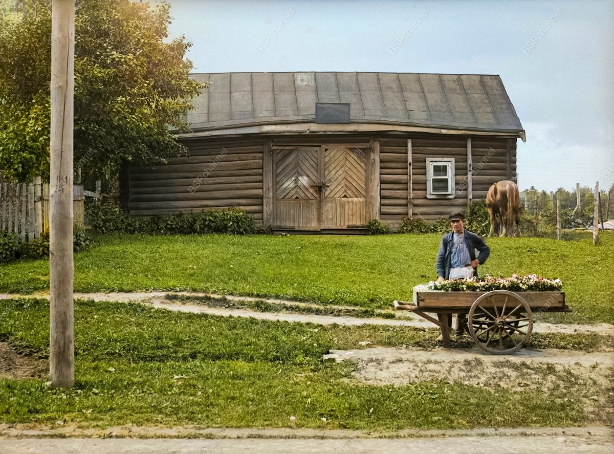 Крестьянин с телегой перед хозяйственной постройкой в Останкино. Москва, 1930-е.