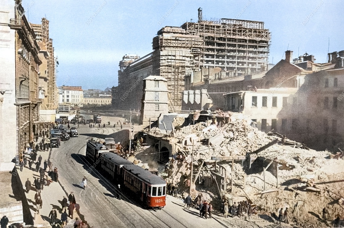 Снос квартала на будущей Манежной площади и строительство гостиницы «Москва». Москва, Моховая улица, 1934 год.