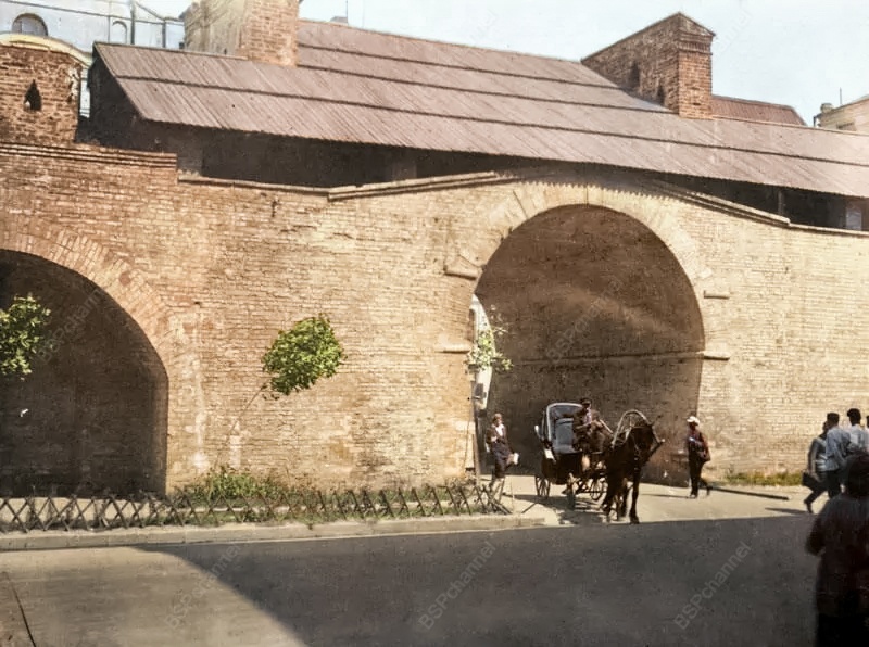 Вдали виднеется Триумфальная арка. Первая её версия деревянная — была возведена в 1814 году в честь торжественного возвращения русской армии из Западной Европы после победы над Наполеоном. Построили её на месте коронационных ворот императора Павла I. Деревянное сооружение быстро пришло в упадок, и в 1826 году император Николай I распорядился построить новую, каменную Триумфальную арку — у Тверской заставы, на въезде в Москву.