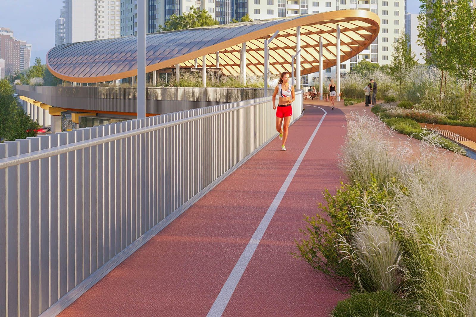 На высоте разместят беговую дорожку протяженностью 4 км, прогулочные аллеи, зоны отдыха с цветниками и деревьями.