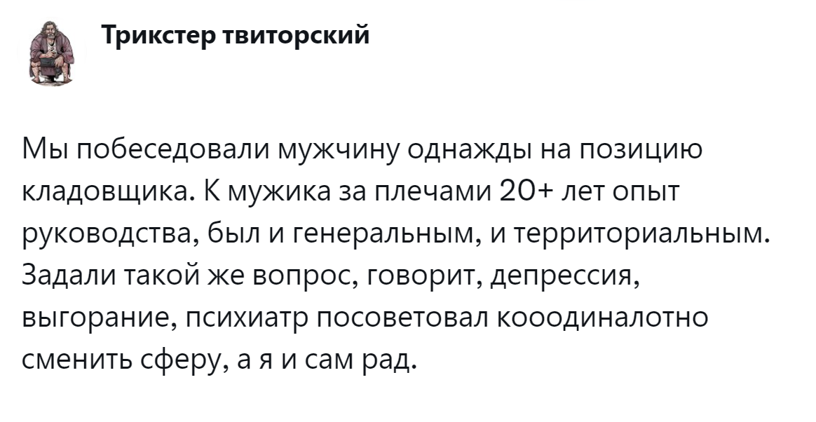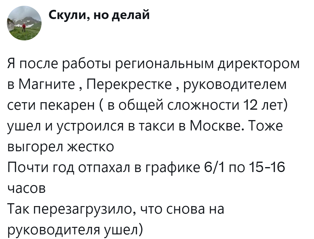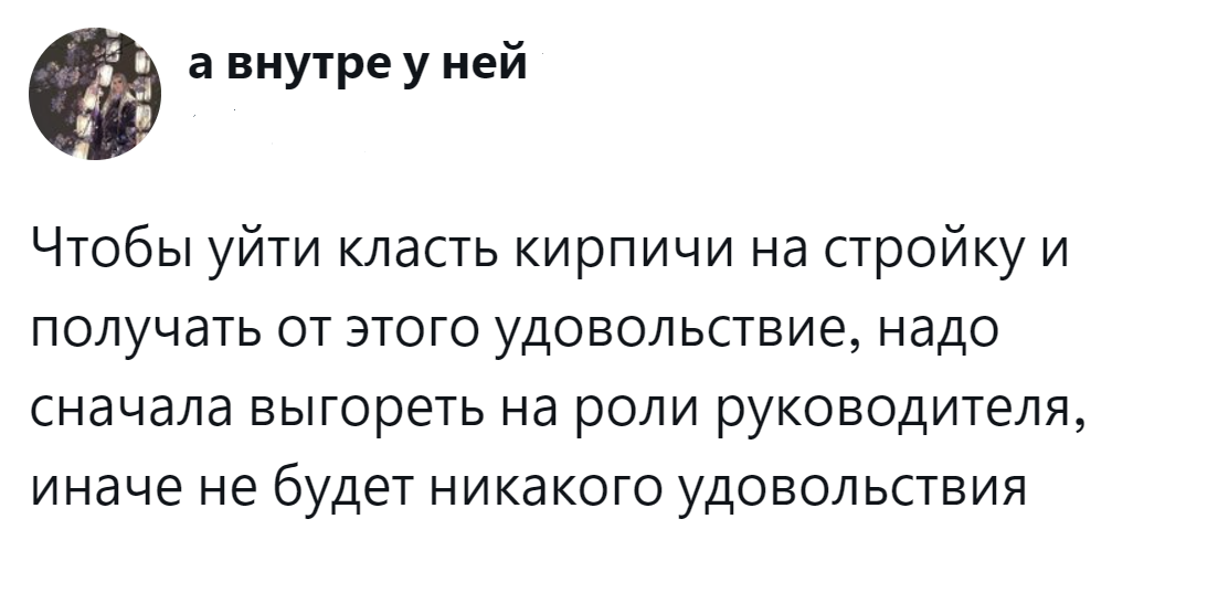 Обладающие её должным запасом люди успевают работать в режиме многозадачности, делают головокружительную карьеру, добиваются руководящих должностей, а потом… идут в дворники. И это не образное выражение. В жизни действительно немало примеров, когда успешные руководители настолько выгорают, что чуть ли не в тайгу уезжают. Или идут в дворники и становятся абсолютно счастливыми. Пользователи рассказали о таких случаях и попытались разобраться в причинах профессионального выгорания.