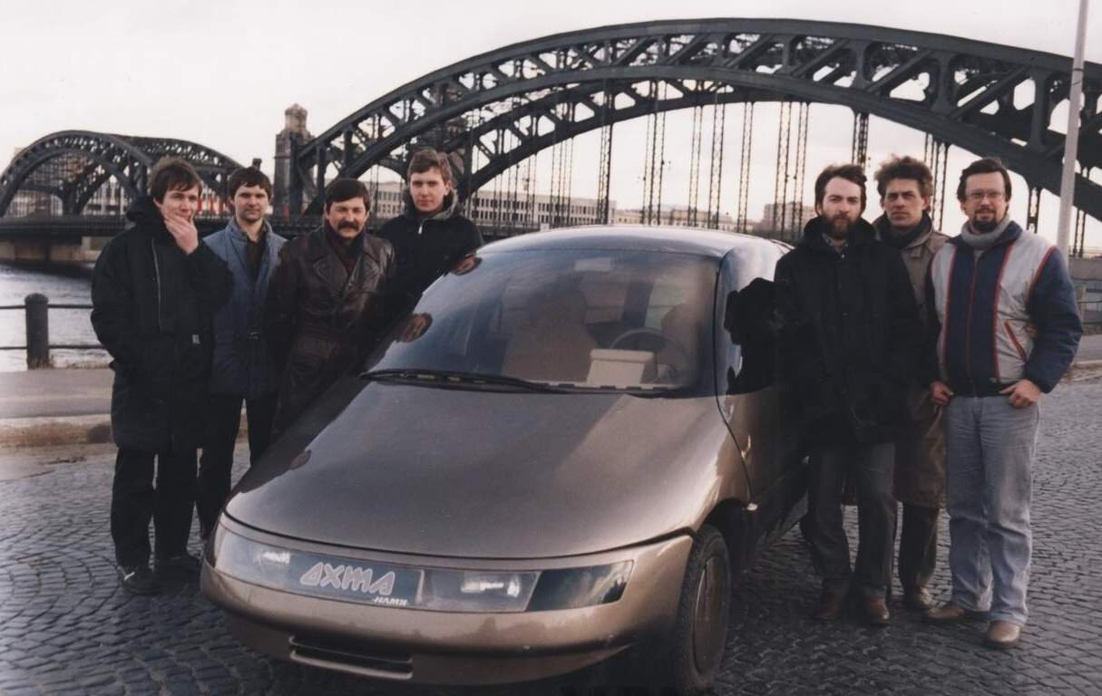 Уникальный автомобильный концепт "Охта" и его создатели позируют на фоне Большеохтинского моста.