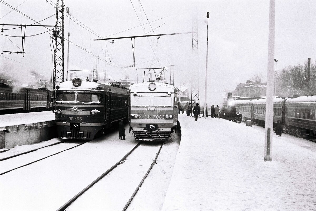Поезда на Витебском вокзале. ЭР2Р что-то совсем подмёрз.