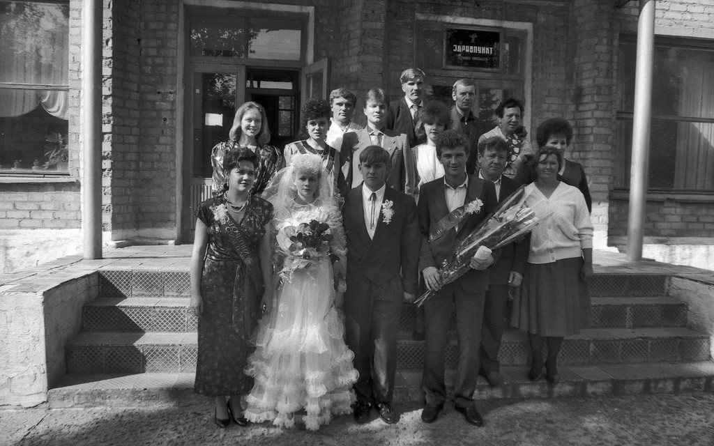 Групповое фото возле ЗАГСа. Сентябрь – октябрь 1993 года. Автор: Павел Сухарев. Донецкая область, город Харцызск.