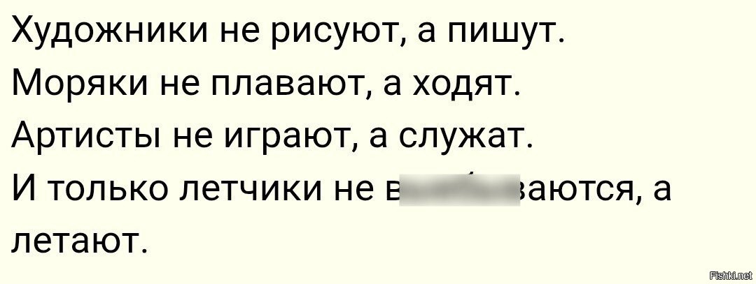Как говорится моряки не плавают, а ходят, артисты не работают, а служат, художники не рисуют, а пишут... только лётчики не вы@бываются, а летают.