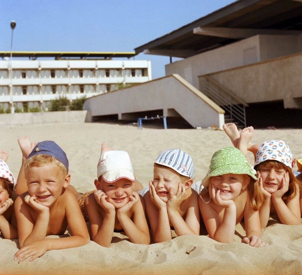 Детвора щурится под южным солнышком на пляже детского санатория "Бригантина" в Евпатории.