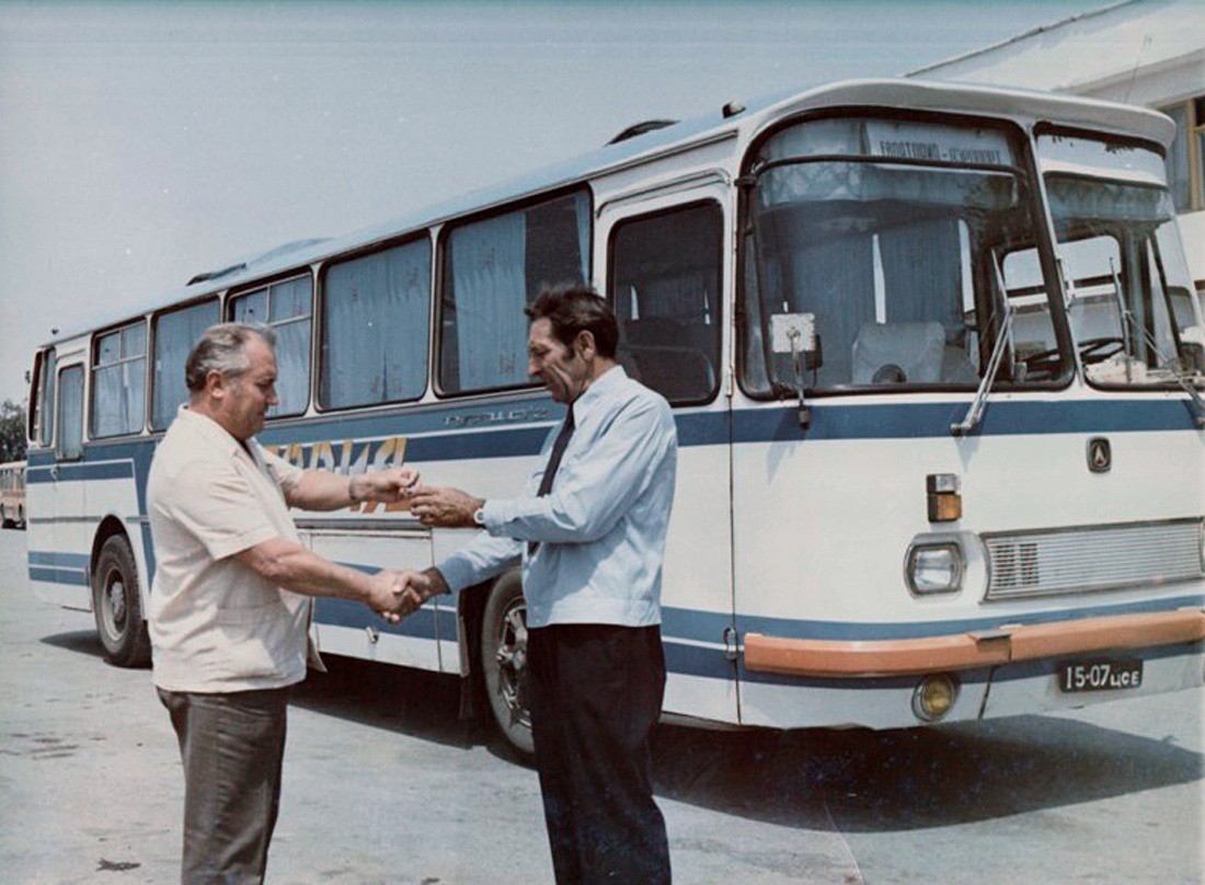 Вручение ключей от автобуса ЛАЗ-699Р в Автотранспортном предприятии №11111 в Евпатории.