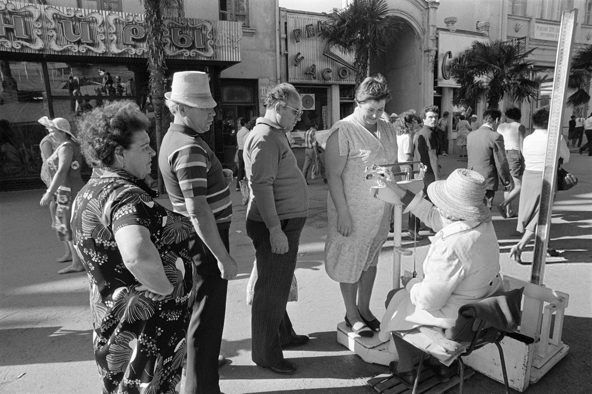 Отпуск это не только море, но и вкусная еда. А после неё неплохо было бы и взвеситься. Сцена на набережной в Ялте.