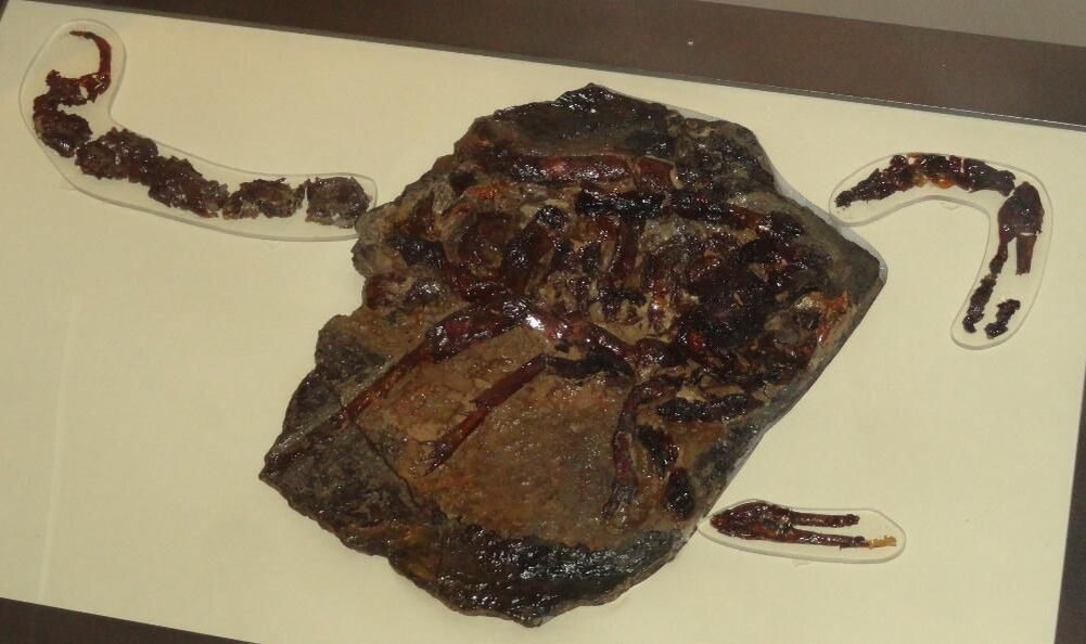 Пульмоскорпионы были пугающе большими членистоногими, длина их тела могла достигать 70 сантиметров! Только представьте себе многоногое и многоглазое существо размером с кошку! И при этом он был вооружён точно так же, как и современные скорпионы. Под толстой бронёй мощные мышцы, на передних лапах — клешни, размером под стать самому пульмоскорпиусу. Ну и, конечно, хвост с ядовитой иглой толщиной со стилет. И пусть состав яда сейчас выяснить невозможно, мы точно знаем, что жалил он жуть как больно!