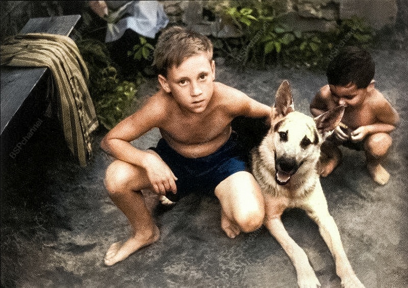 Мальчики с собакой. В камеру смотрят овчарка по кличке Карат и 12-летний гость из Москвы - Володя Высоцкий. Украинская ССР, г. Гайсин, 1950 год.