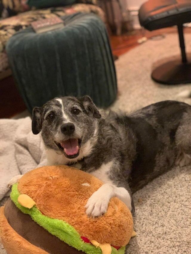 Я выиграл гигантский плюшевый чизбургер. Добавил наполнителя, поместил внутрь сразу 20 пищалок. Пёс счастлив!