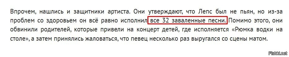 Впрочем, нашлись и защитники артиста. Они утверждают, что Лепс был не пьян, но из-за проблем со здоровьем он всё равно исполнил все 32 заявленные песни. Помимо этого, они обвинили родителей, которые привели на концерт детей, где исполняется «Рюмка водки на столе», а затем принялись жаловаться, что певец несколько раз выругался со сцены матом.