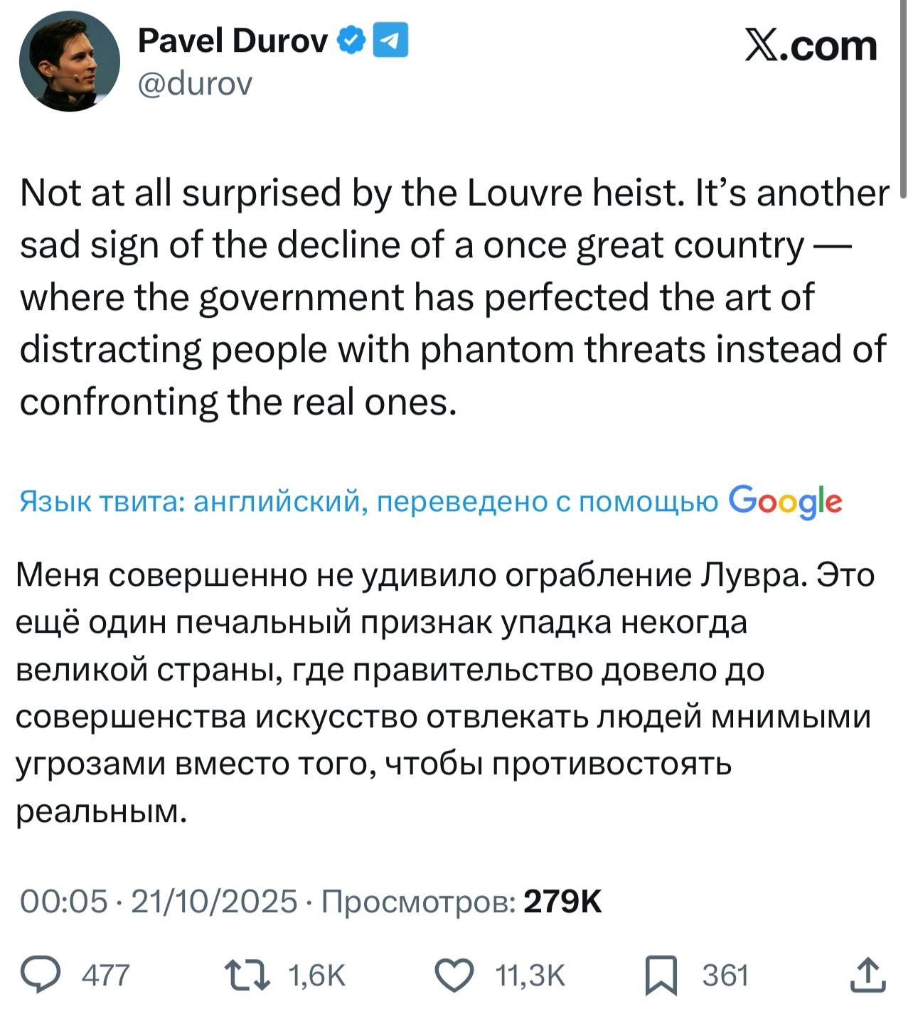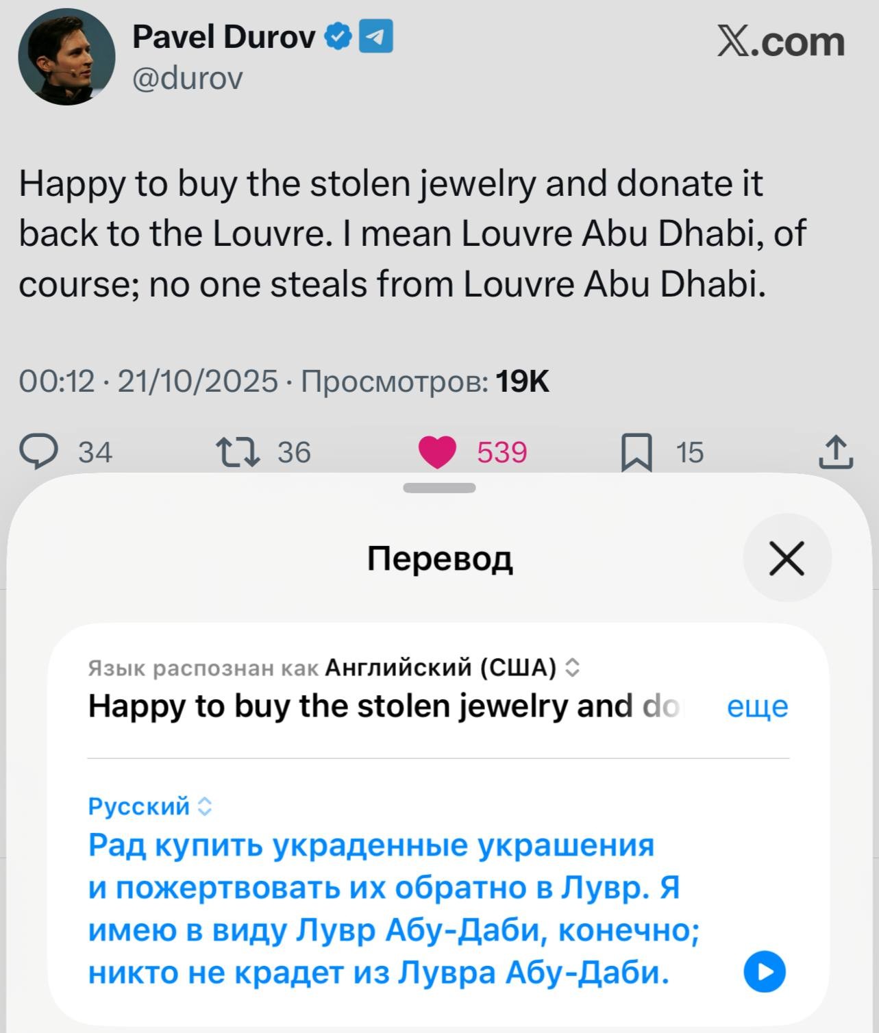 Основатель Telegram Павел Дуров вновь оказался в центре внимания после громкого ограбления Лувра. В соцсети Х он заявил, что с радостью выкупит украденные из музея драгоценности и передаст их в музей в Абу‑Даби. По словам бизнесмена, из этого музея никто ничего не ворует, что он назвал символом стабильности и безопасности.