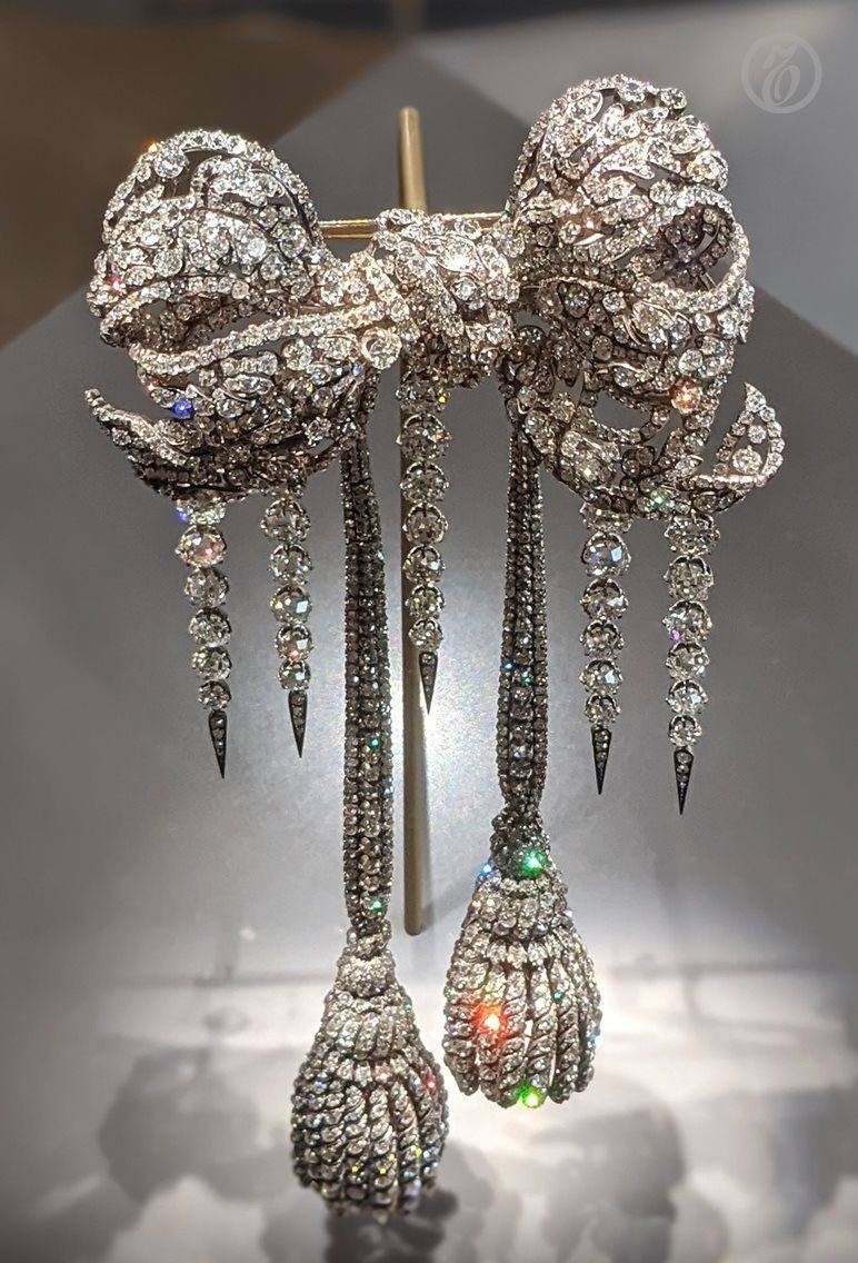 — Диадема из жемчуга и бриллиантов, брошь в стиле рокайль и большой бриллиантовый бант для корсажа императрицы Евгении.