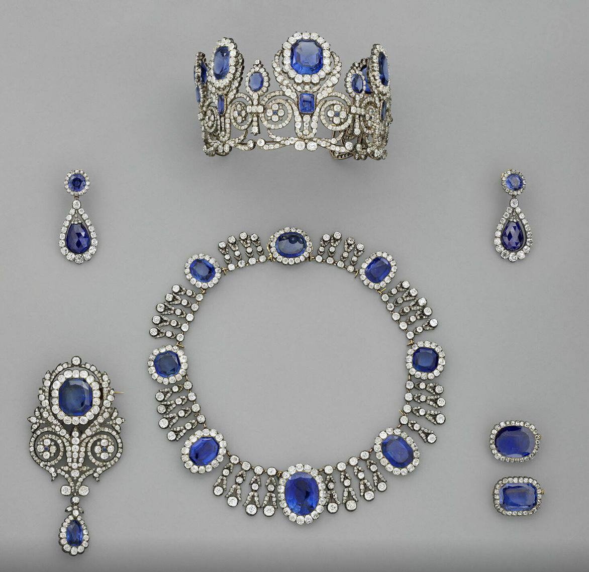 — Диадема, ожерелье и серьги из сапфирового гарнитура королевы Марии-Амалии и Гортензии де Богарне. Ожерелье сделано из восьми сапфиров и 631 бриллиантов, а диадема украшена 24 сапфирами и 1083 бриллиантами.