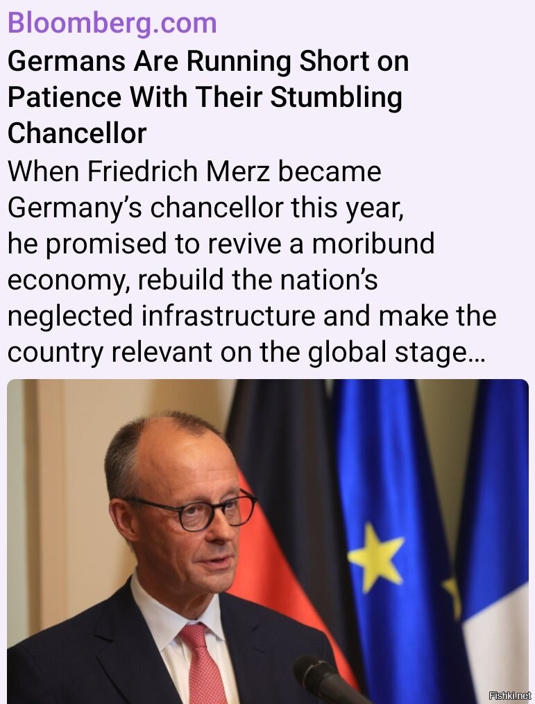 Американское издание Bloomberg пророчит канцлеру ФРГ Фридриху Мерцу не самые лучшие времен. Во время избирательной кампании политик обещал остановить наплыв мигрантов, выбраться из экономического кризиса и сделать Бундесвер сильной армией. Не одно из обещаний так и не было выполнено, а проблемы стали только острее. Согласно данным социологических опросов, только 16% немцев готовы поддержать кандидатуру Мерца на следующих выборах.