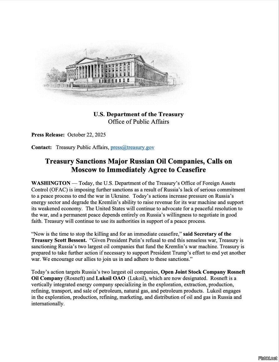 Дональд Трамп: Минфин США вводит санкции против крупнейших российских нефтяных компаний (Роснефть, Лукойл, а также их дочерних предприятий), и призывает Москву немедленно согласиться на прекращение огня.