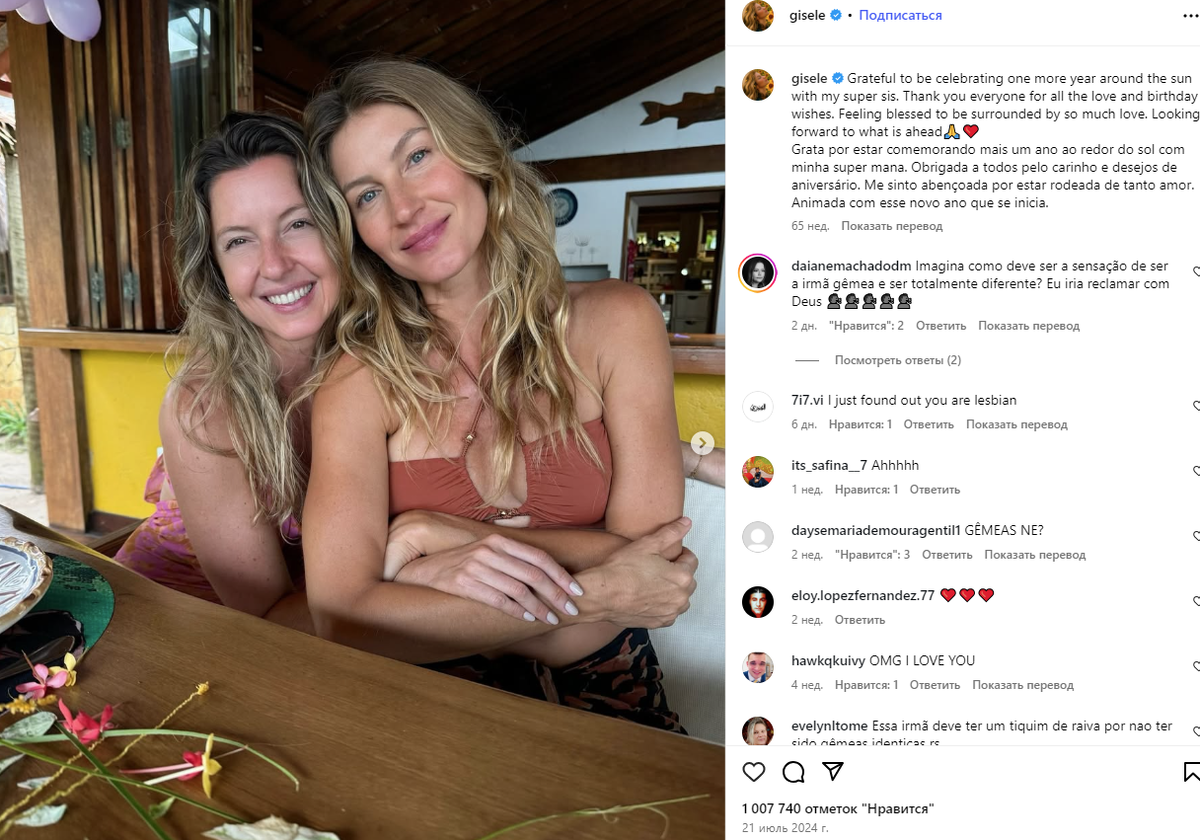 Жизель Бюндхен и её сестра-близнец Патрисия неразлучны. Это легко заметить по соцсетям модели, где она часто пишет тёплые слова в адрес сестры. Патрисия на пять минут старше сестры.