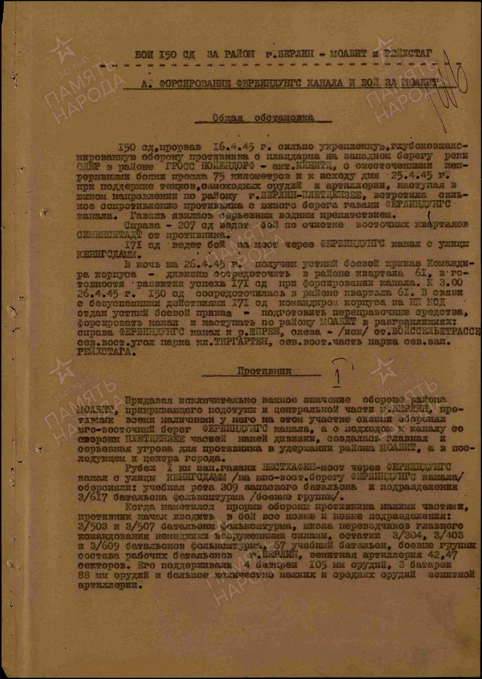 Как итог, к вечеру части дивизии вышли с севера к Шпрее от канала до моста "Левитцов штрассе"(название из документа) и частично заняли парк Тиргартен. На следующий день бои продолжились, наибольшие проблемы создал гарнизон тюрьмы Маобит, который упорно оборонялся, капитулировали фашисты только после полного окружения. Так же в отчёте был отмечен случай, когда рота фольксштурма сдалась в полном составе. Как говорится, вовремя принятое правильное решение. К исходу 28 апреля части 150-й сд вышли к Шпрее широким фронтом и достигли моста Мольтке, который враг не взорвал. Точнее не взорвала частная контора, которая решила самоустраниться. Теперь подразделениям 150-й сд предстояло форсировать реку и приступить к боям уже за Рейхстаг. А у меня на этом все. Спасибо за внимание. До свидания! Источник: канал "Наша история это Гордость".