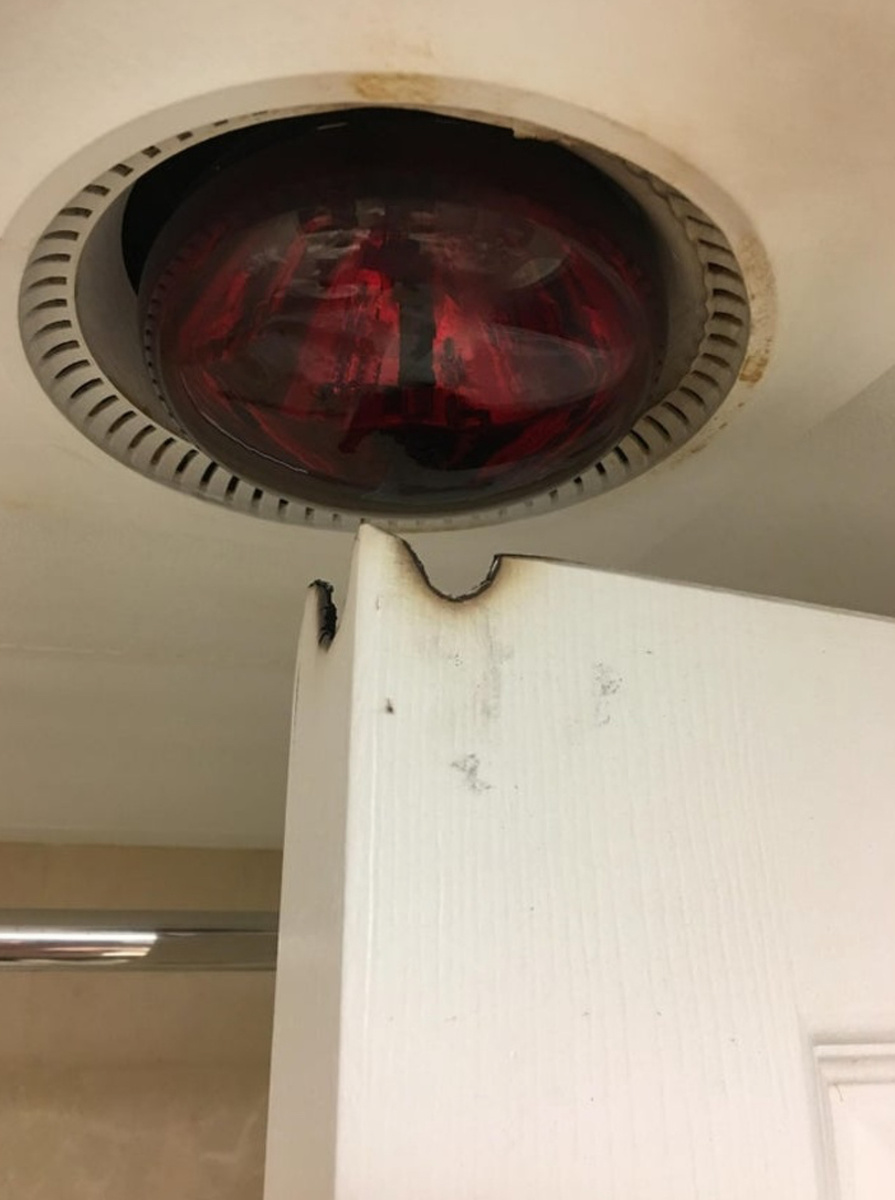 2. Лампа проплавила дверь — чудом обошлось без пожара