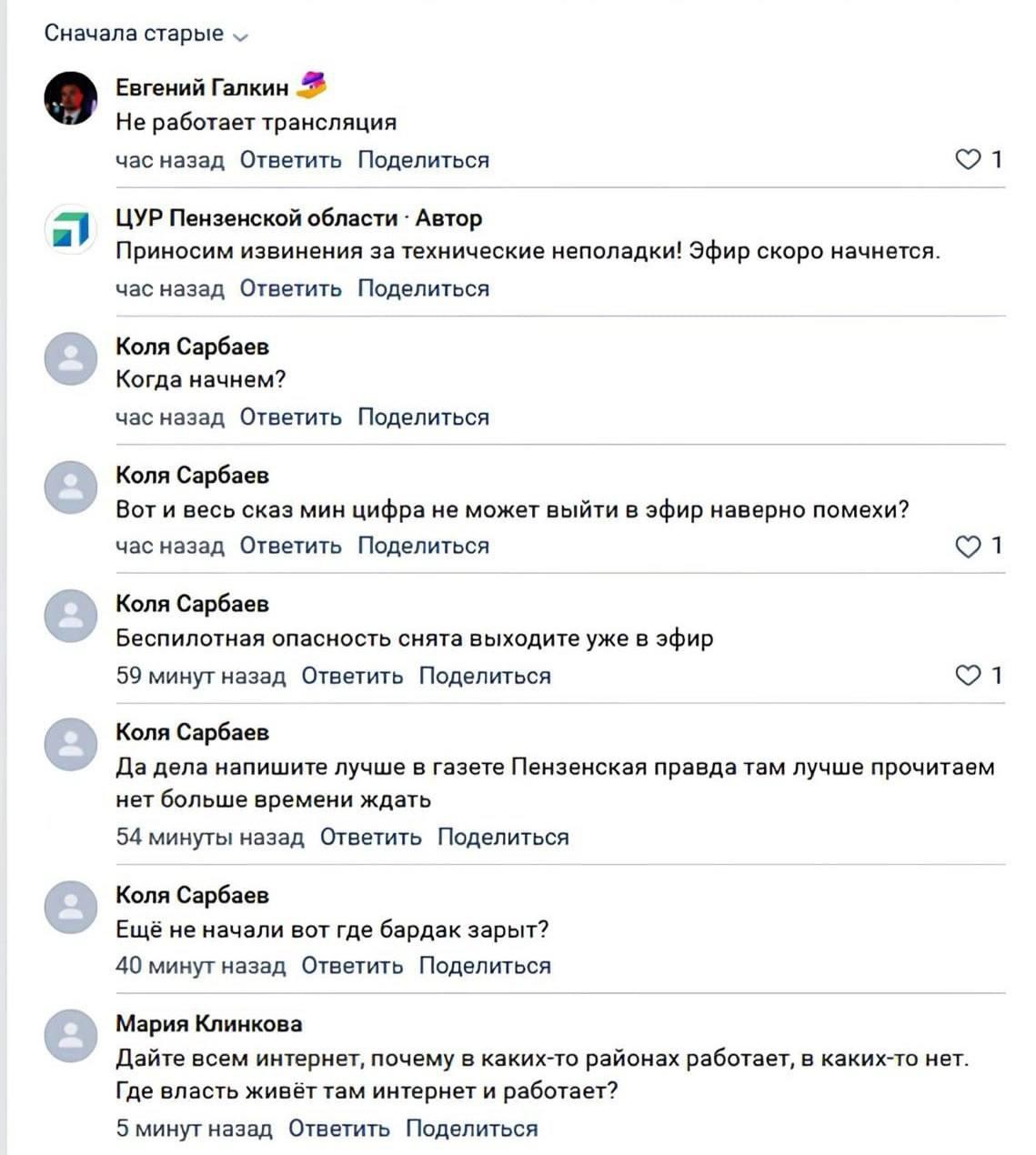 Представители Центра управления регионом принесли извинения за технические сбои и пообещали, что эфир будет возобновлён позже, однако повторного полноценного эфира пока не было. Тема была крайне актуальна для жителей Пензы, которые жалуются на сложности с мобильным интернетом.