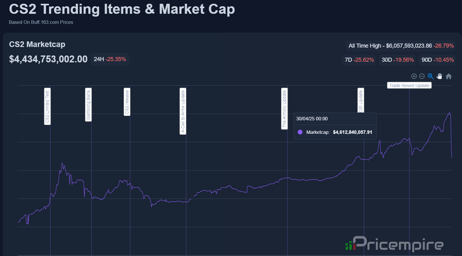 На вчерашний день рыночная капитализация скинов и других внутриигровых предметов составляла 4,4 миллиарда долларов, хотя ранее в октябре она достигла исторического максимума в шесть миллиардов.