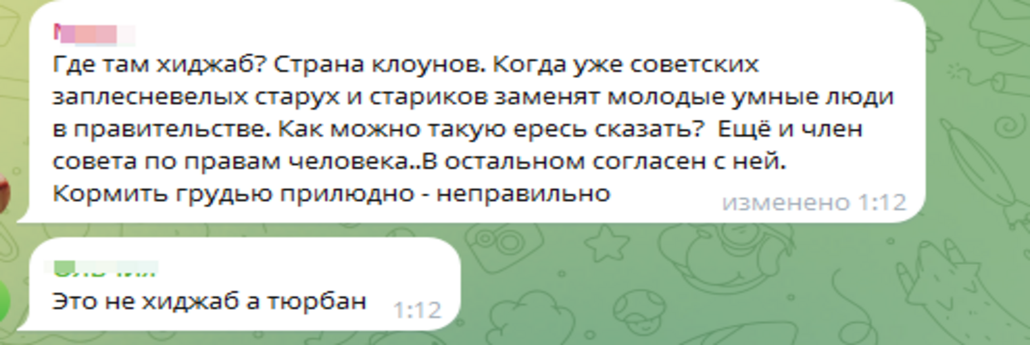 Член Совета по правам человека Марина Ахметова в своём Телеграм-канале заметила, что транслируемый образ скромности, которым обычно апеллируют в защиту платков и хиджабов, как-то не вяжется с поведением женщины.