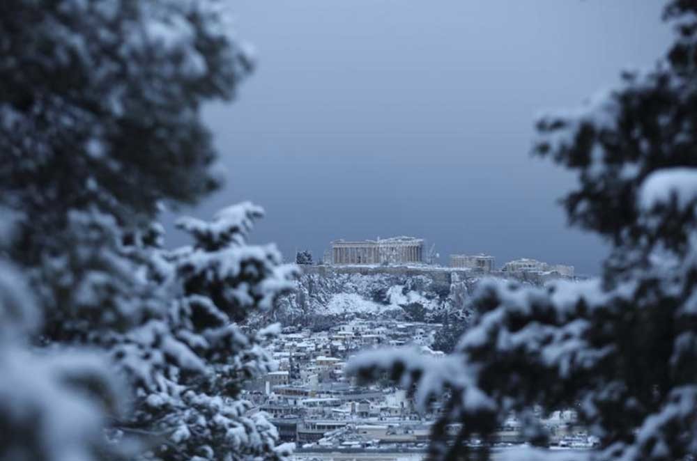 16. Редкий кадр - вид на заснеженный Афинский Акрополь