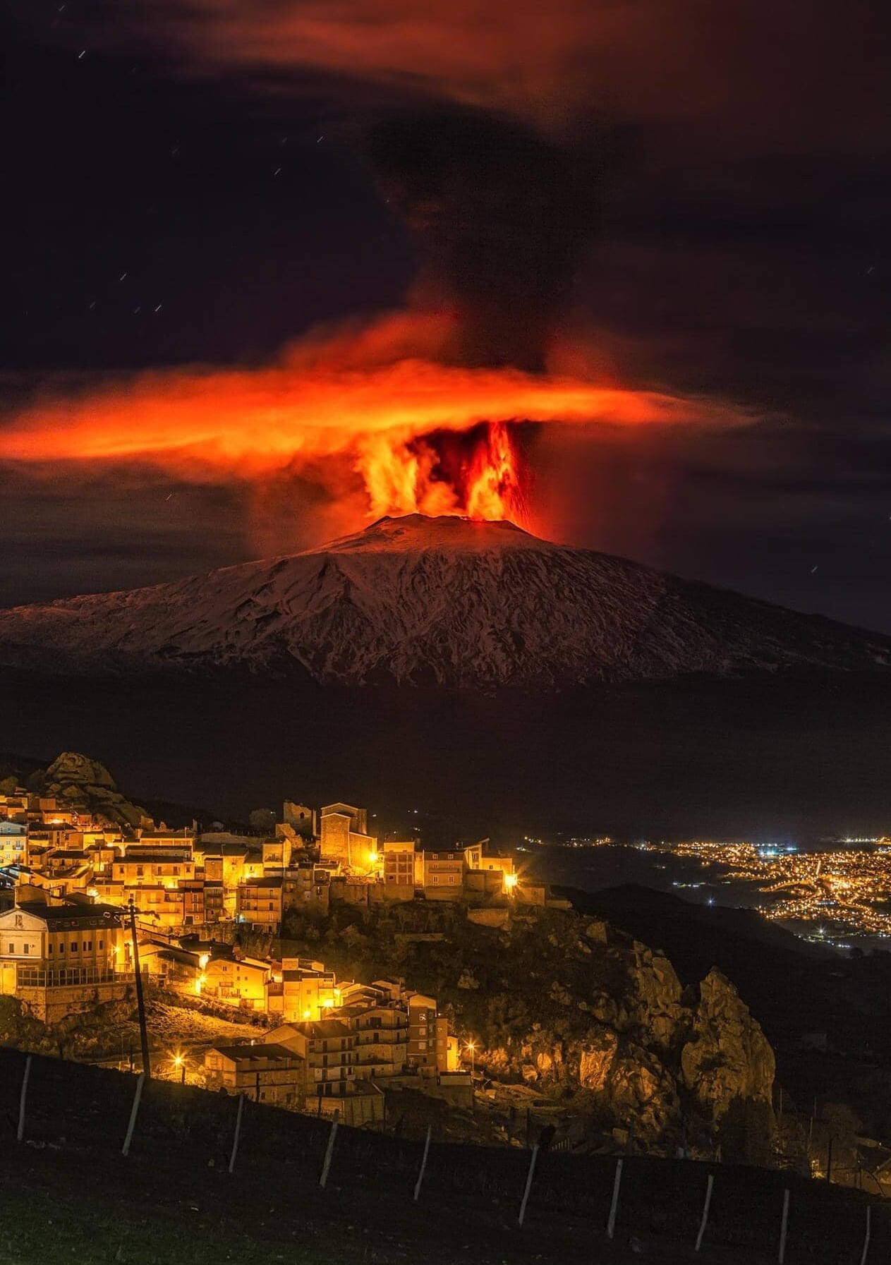 4. Извержение вулкана Этна освещает небо над Сицилией, 2021 год