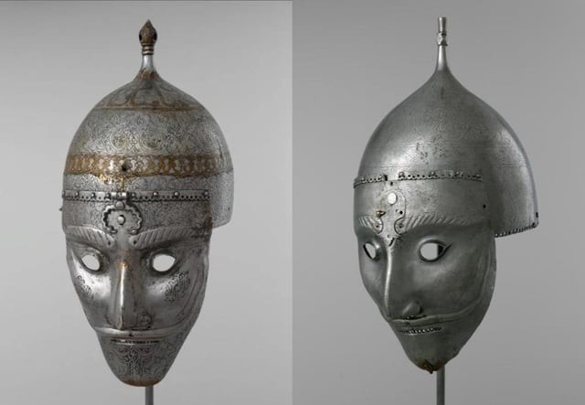 10. Два 500-летних персидских шлема, изготовленных из позолоченной стали, с богато украшенными металлическими масками