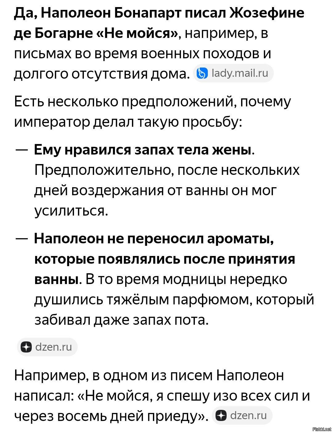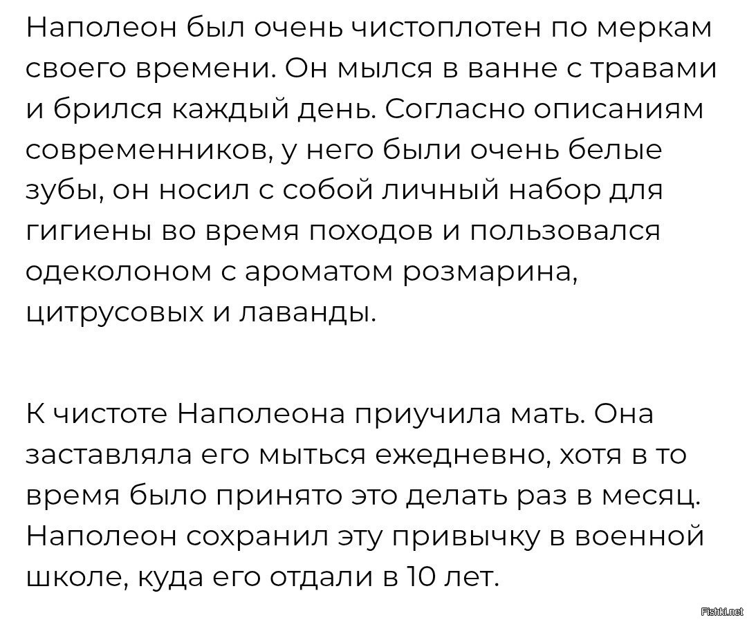 К чистоте Наполеона приучила мать. Она заставляла его мыться ежедневно, хотя в то время было принято это делать раз в месяц. Наполеон сохранил эту привычку в военной школе, куда его отдали в 10 лет.
