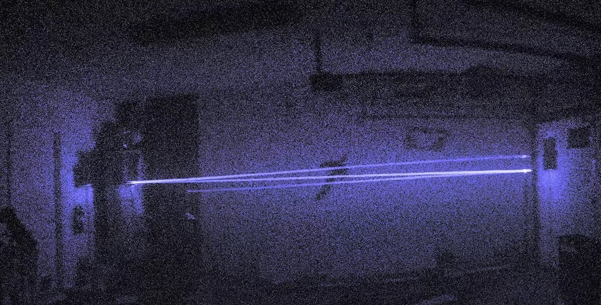 Самодельная камера энтузиаста использует мощный лазер, луч которого пересекает пространство гаража, отражается от зеркала и движется зигзагом между параллельными зеркалами, прежде чем достигнуть стены. Частички тумана в воздухе рассеивают свет, делая его видимым для сенсора. На скорости в два миллиарда кадров в секунду луч света превращается в завораживающее зрелище, ведущее себя странным, почти фантастическим образом.
