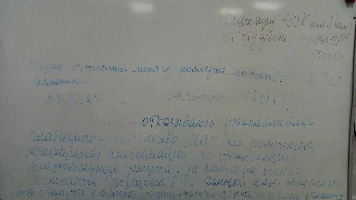 «Я принципиально отказываюсь устанавливать платформу — мессенджер MAX для получения официальной информации по организации образовательного процесса, несмотря на приказ Министерства просвещения РФ. Данный факт свидетельствует о том, что к образовательному процессу, в котором я учусь, не имею отношения. Прошу отчислить меня из колледжа по собственному желанию», — было написано на доске.