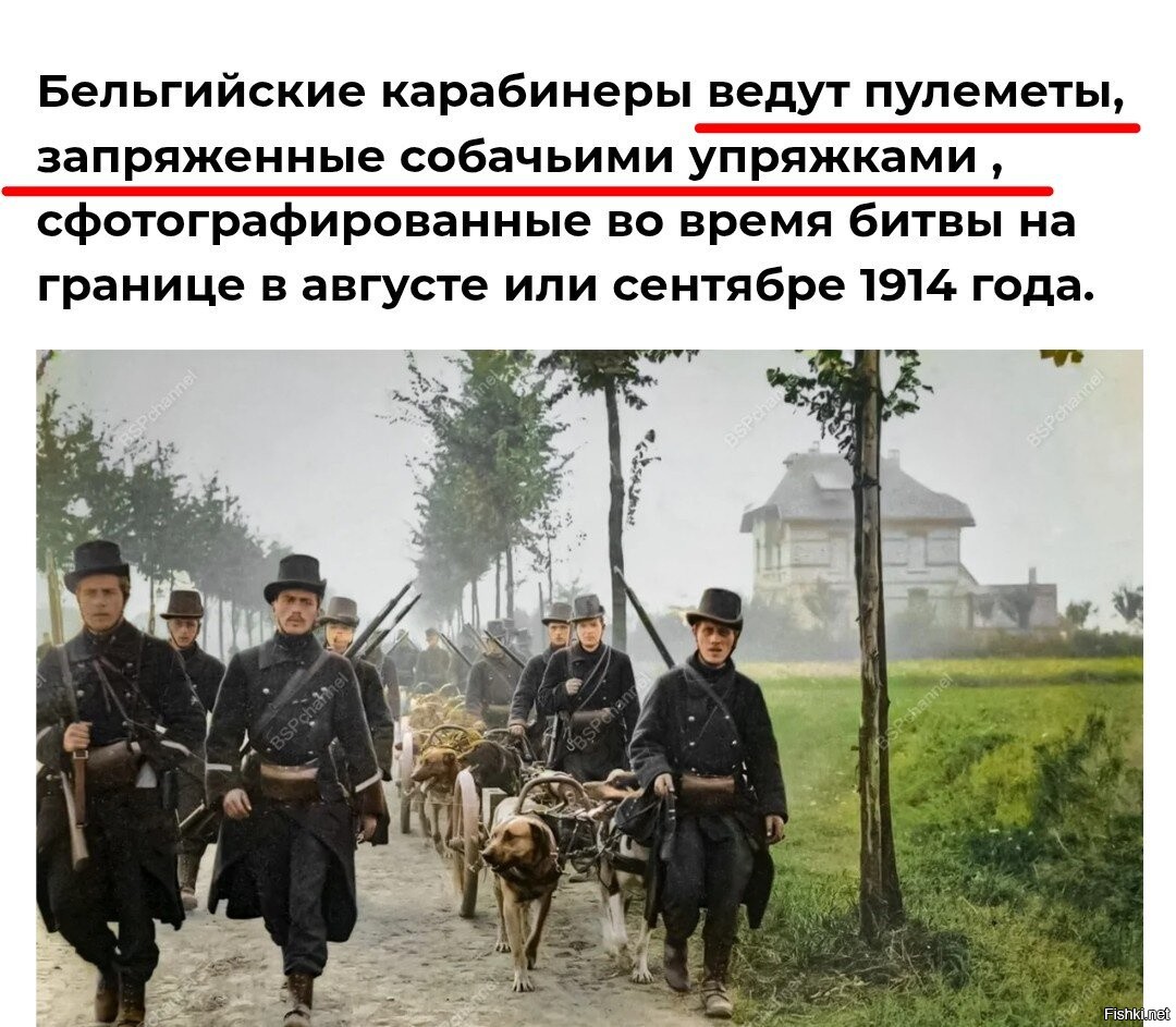 Бельгийские карабинеры ведут пулеметы, запряженные собачьими упряжками , сфотографированные во время битвы на границе в августе или сентябре 1914 года.