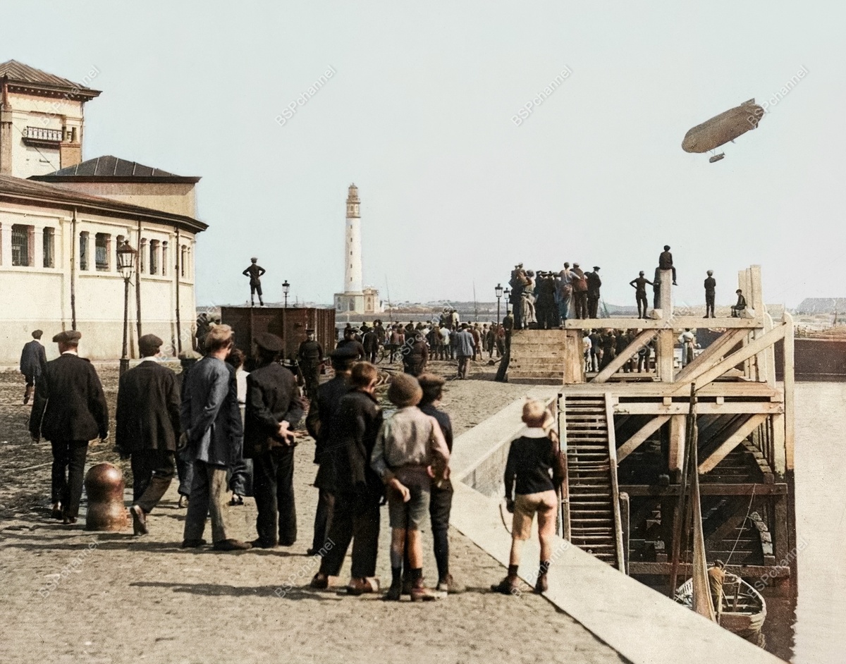 Толпа наблюдает за британским дирижаблем, пролетающим над портом в Остенде во время Первой мировой войны, 1914 год.